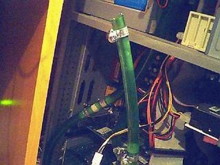 No właśnie i co ja mam z tym zrobić? Układ jest zamknięty wiec nie ma fizycznie miejsca gdzie powietrze mogłoby się zbierać. Dodatkowy pojemnik... heh ciężka sprawa, za mało miejsca. Co wiec ja biedny mogę zrobić. Najpierw odpowietrzyłem układ. Ok. znowu cisza, ale to nie rozwiązuje problemu, za jakiś czas znowu pewnie pojawi się i pompka zacznie szumieć. Zacząłem wiec kombinować. A jakby połączyć zalety układu otwartego z układem zamkniętym. I co mi przyszło do głowy.... ot prosta tytułowa rurka. Rozciąłem wąż za pompką i wstawiłem trójnik, na razie T, ale jak przyjdzie czas to wymienię go na Y i do trzeciej końcówki dołączyłem kawałek rurki.